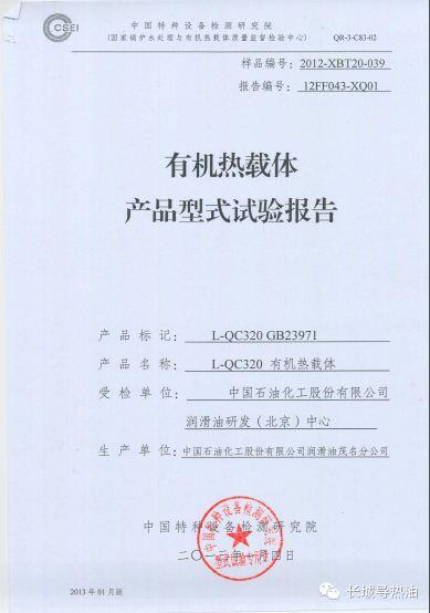 第三,選擇導(dǎo)熱油要看油品的質(zhì)量,只有通過(guò)國(guó)標(biāo)要求的產(chǎn)品才是合格產(chǎn)品,國(guó)內(nèi)導(dǎo)熱油的權(quán)威評(píng)定機(jī)構(gòu)為中國(guó)鍋爐水處理協(xié)會(huì),為符合國(guó)家標(biāo)準(zhǔn)的產(chǎn)品提供產(chǎn)品認(rèn)可證書(shū),如長(zhǎng)城L-QC320礦物油型導(dǎo)熱油型式試驗(yàn)證書(shū)如下:
